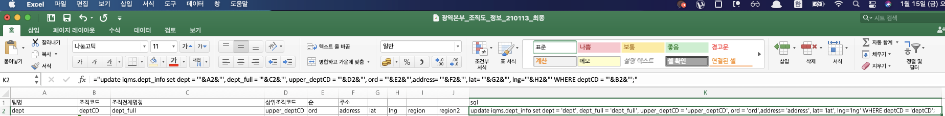 1. 위와같이 작성하고 아래로 쭉 드래그해서 Excel의 나머지 데이터들에도 update문을 병렬적으로 생성해준다.