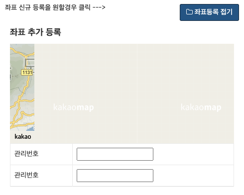 아래 그림처럼, [좌표등록] 버튼을 누르면 카카오맵으로 좌표 선택을 하기를 바랐다. 그치만 보이는 것처럼 지도가 잘린다.