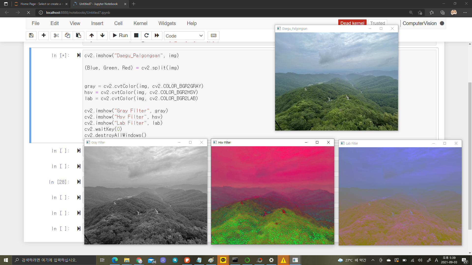 가상환경 접속 후 설치된 리스트 확인 -> OpenCV설치 -> 주피터노트북으로 설치 확인
